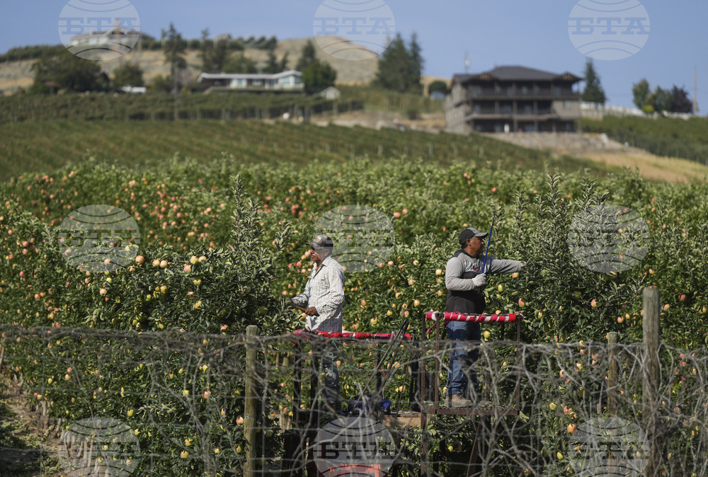 Workers prune apple trees in an orchard in Vernon, B.C., on Friday, Sept. 12, 2025. (Darryl Dyck/The Canadian Press via AP)