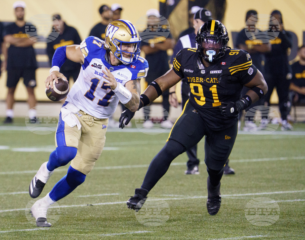 Winnipeg Blue Bombers quarterback Chris Streveler (17) is pursued by Hamilton Tiger-Cats defensive lineman Miles Fox (91) during second half CFL football game action in Hamilton, Ont. on Friday, Sept. 12, 2025. (Peter Power/The Canadian Press via AP)