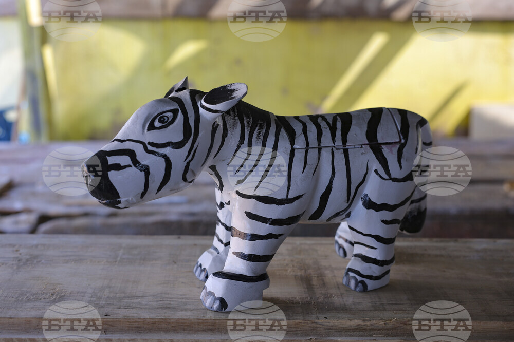 A miniature zebra fantasy coffin prototype crafted by Eric Kpakpo Adotey is displayed in his shop in La, Accra, Ghana, Friday, July 25, 2025. (AP Photo/Misper Apawu)