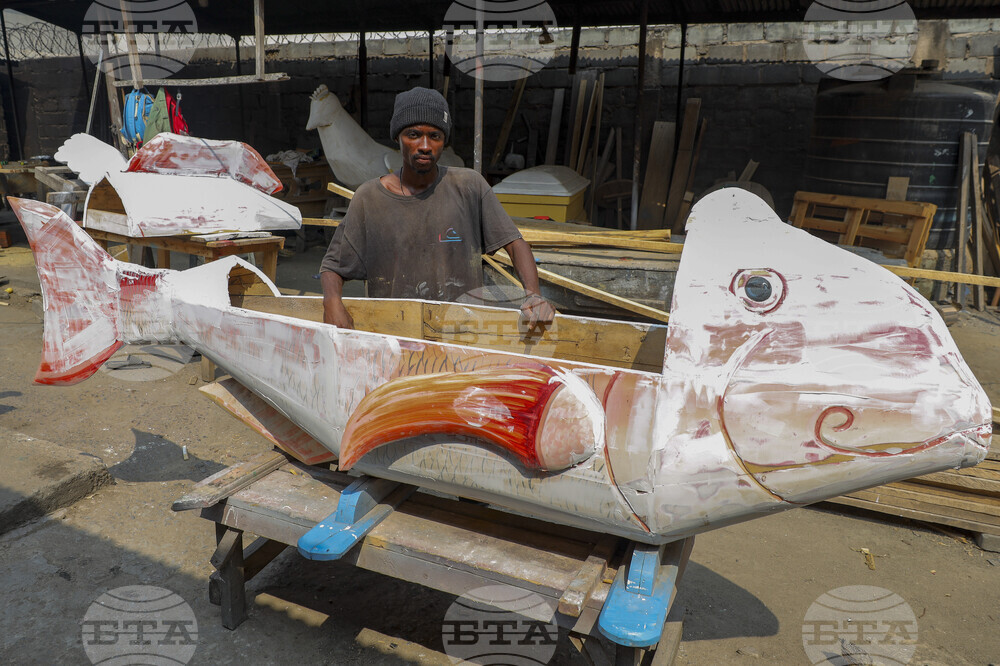Nicholas Ablorh Annan, poses by a fish-shaped fantasy coffin in production, at his father's workshop in Teshie, Accra, Ghana, Tuesday, July 29, 2025. (AP Photo/Misper Apawu)