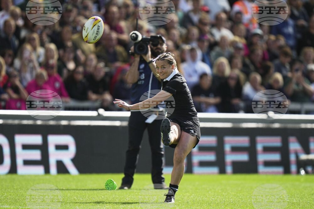 New Zealand's Braxton Sorensen-McGee kicks the ball to convert a try during the Women's Rugby World Cup 2025 quarterfinal match between New Zealand and South Africa, in Exeter, England, Saturday, Sept. 13, 2025. (AP Photo/Alastair Grant)