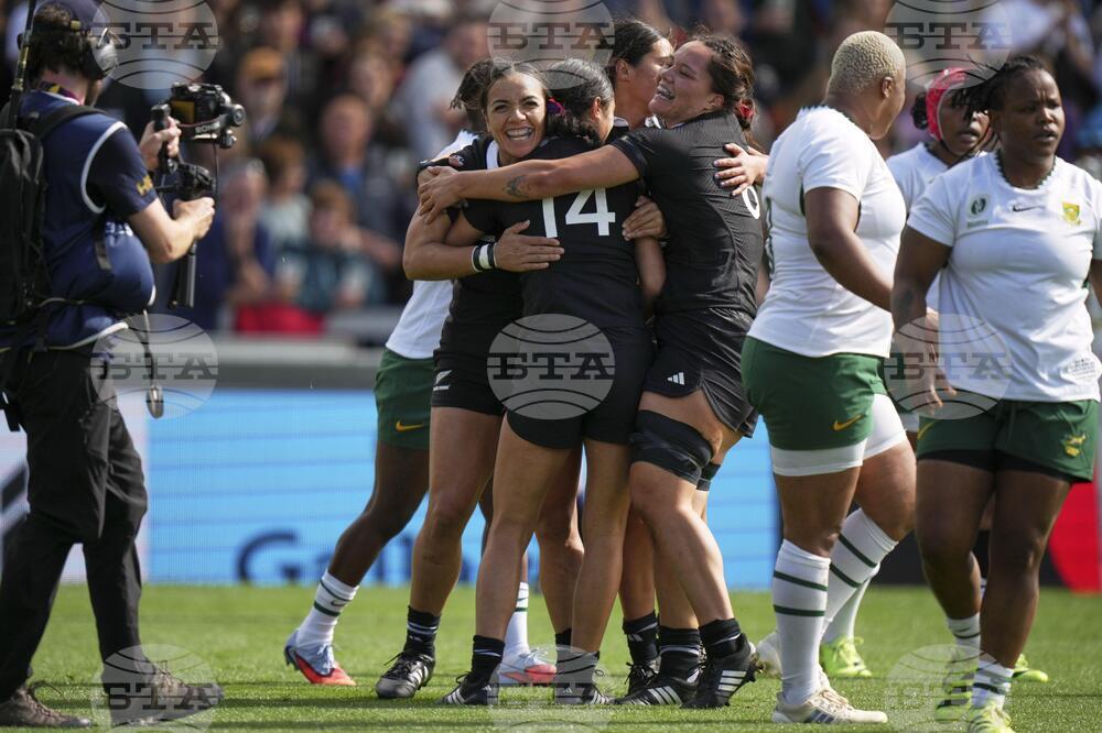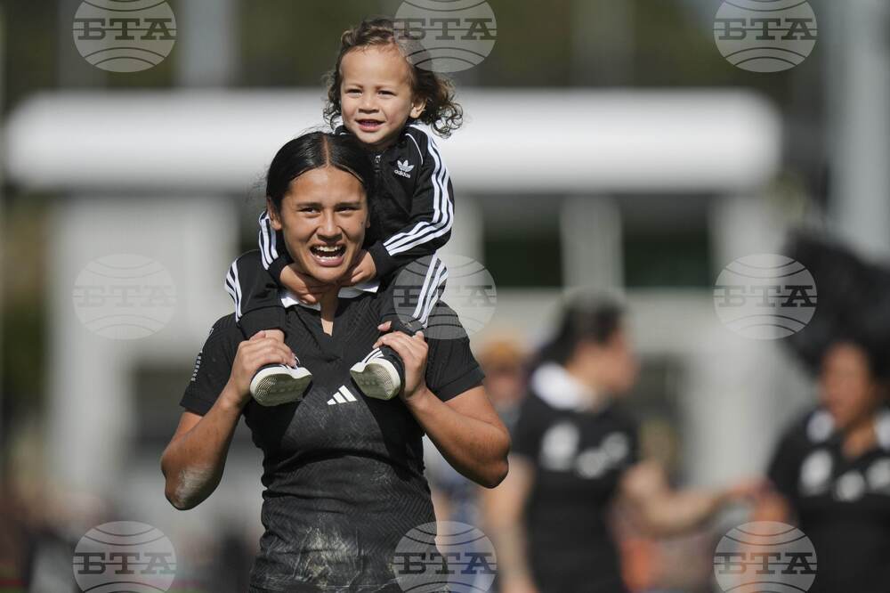New Zealand's Braxton Sorensen-McGee holds a Childs as she celebrate following the Women's Rugby World Cup 2025 quarterfinal match between New Zealand and South Africa, in Exeter, England, Saturday, Sept. 13, 2025. (AP Photo/Alastair Grant)