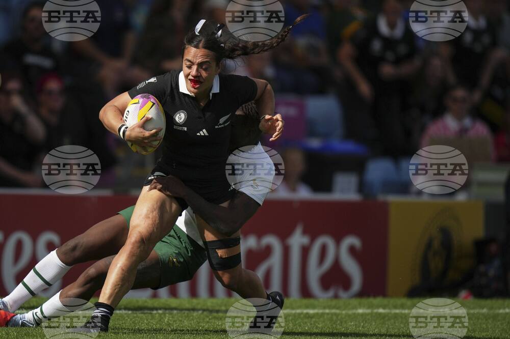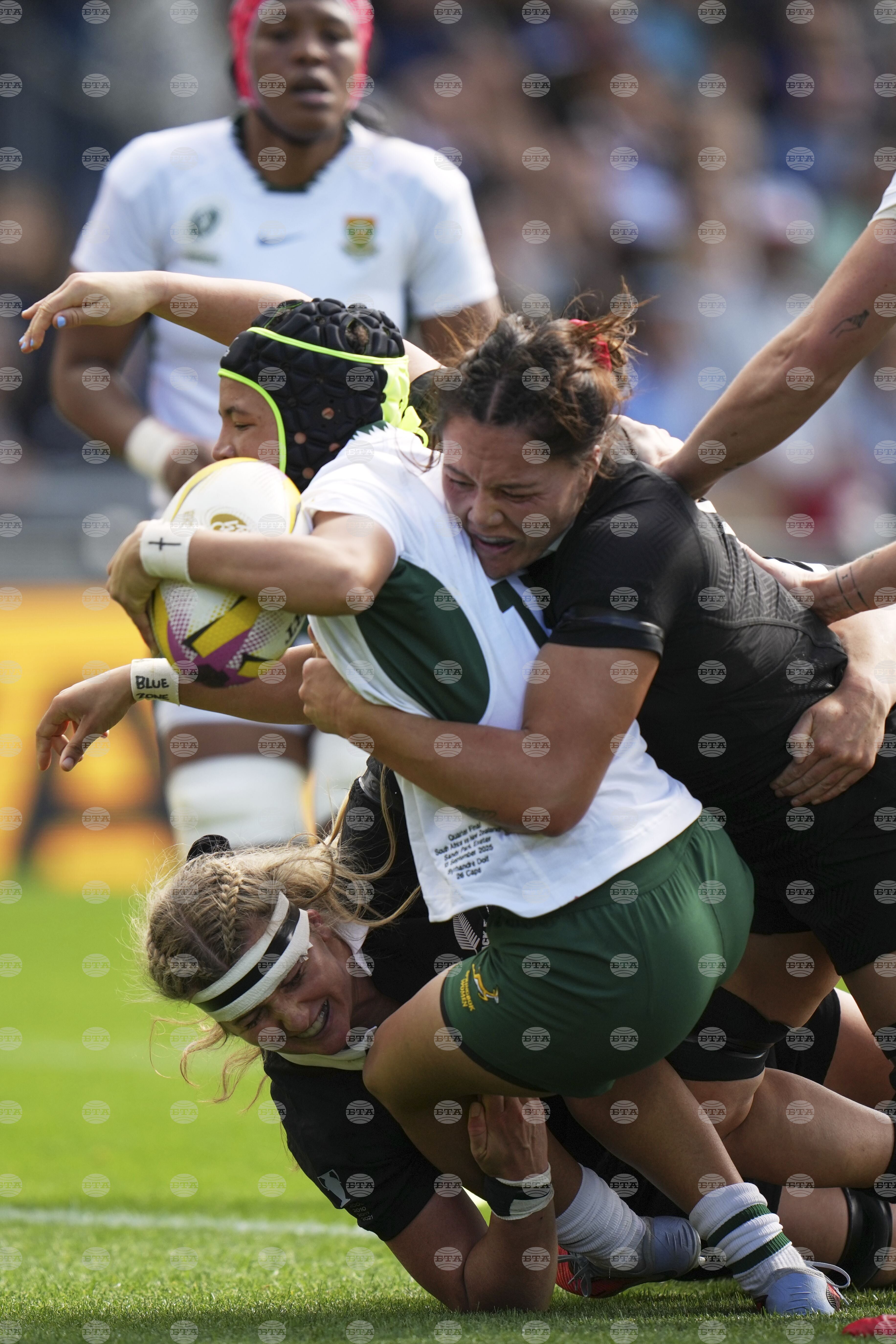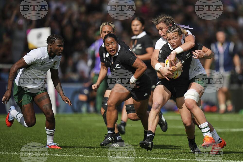 New Zealand's Portia Woodman-Wickliffe, right, is tackled by South Africa's Libbie Janse van Rensburg, bottom, during the Women's Rugby World Cup 2025 quarterfinal match between New Zealand and South Africa, in Exeter, England, Saturday, Sept. 13, 2025. (AP Photo/Alastair Grant)
