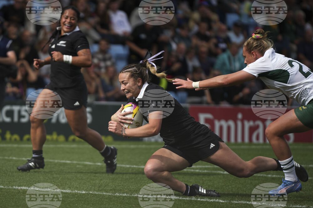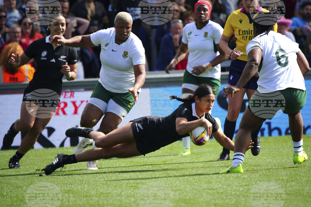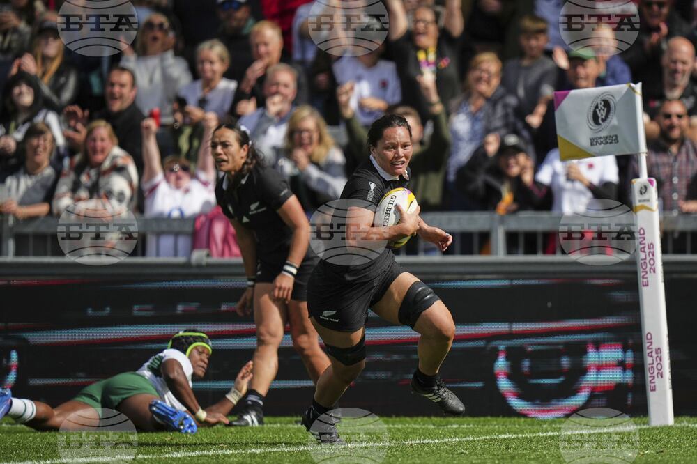 New Zealand's Theresa Setefano, left, scores their side's second try during the Women's Rugby World Cup 2025 quarterfinal match between New Zealand and South Africa, in Exeter, England, Saturday, Sept. 13, 2025. (Ben Birchall/PA via AP)