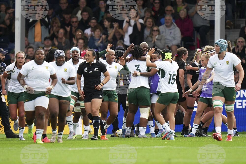 South Africa's players celebrates a try during the Women's Rugby World Cup 2025 quarterfinal match between New Zealand and South Africa, in Exeter, England, Saturday, Sept. 13, 2025. (AP Photo/Alastair Grant)