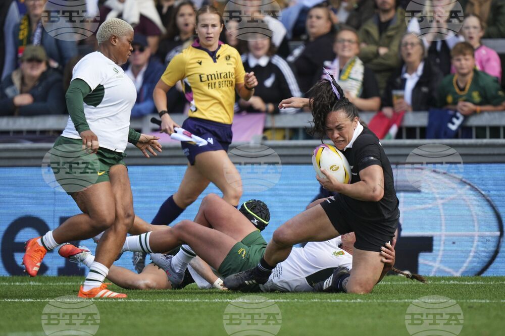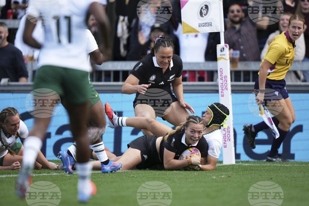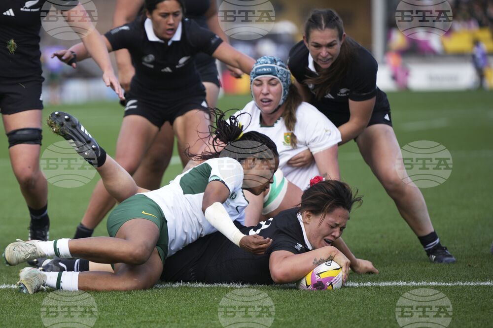 New Zealand's Braxton Sorensen-McGee, right, scores a try as South Africa's Nadine Roos, center, tries to defend during the Women's Rugby World Cup 2025 quarterfinal match between New Zealand and South Africa, in Exeter, England, Saturday, Sept. 13, 2025. (AP Photo/Alastair Grant)