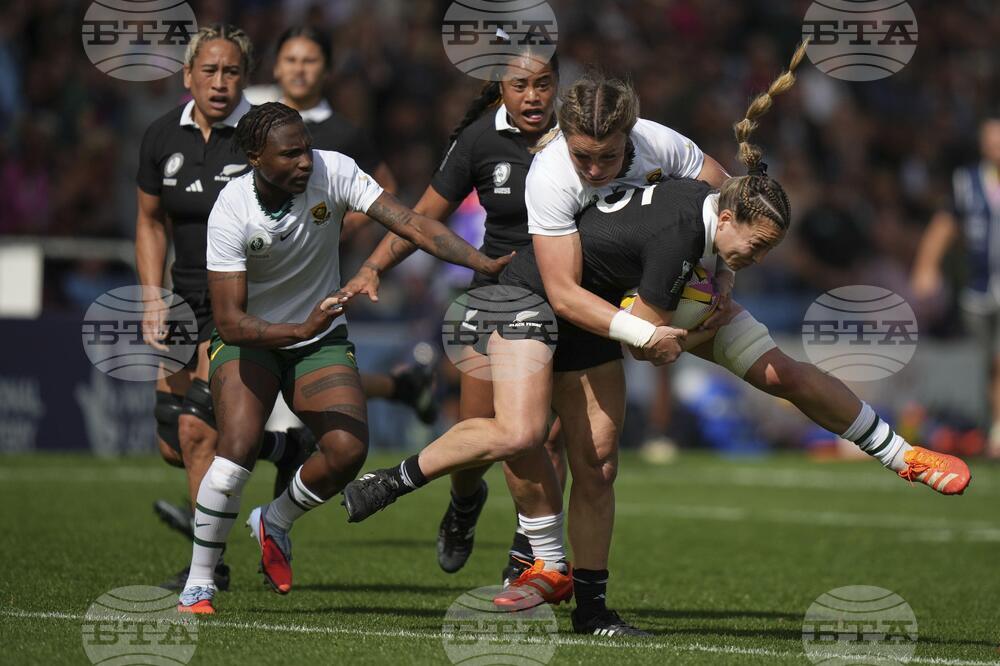 South Africa's Aphiwe Ngwevu, centre, tackled by New Zealand's Alana Bremner, bottom, and teammate Jorja Miller during the Women's Rugby World Cup 2025 quarterfinal match between New Zealand and South Africa, in Exeter, England, Saturday, Sept. 13, 2025. (AP Photo/Alastair Grant)