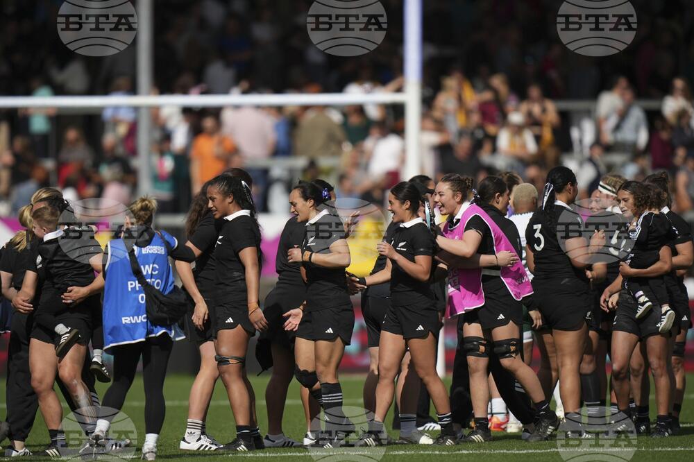 New Zealand's players celebrate following the Women's Rugby World Cup 2025 quarterfinal match between New Zealand and South Africa, in Exeter, England, Saturday, Sept. 13, 2025. (AP Photo/Alastair Grant)