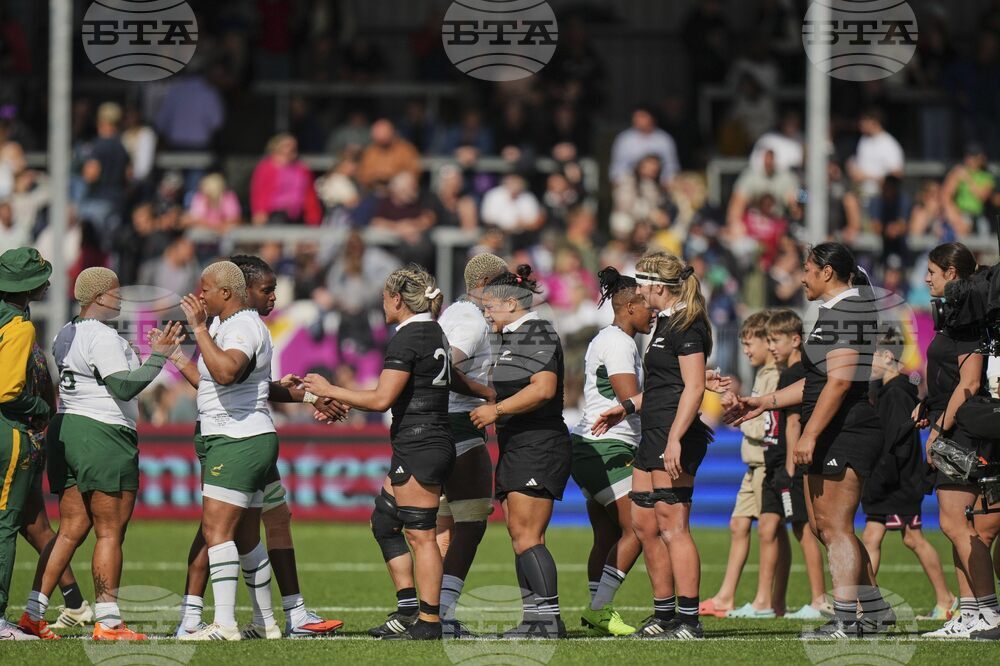 Players shake hands following the Women's Rugby World Cup 2025 quarterfinal match between New Zealand and South Africa, in Exeter, England, Saturday, Sept. 13, 2025. (AP Photo/Alastair Grant)