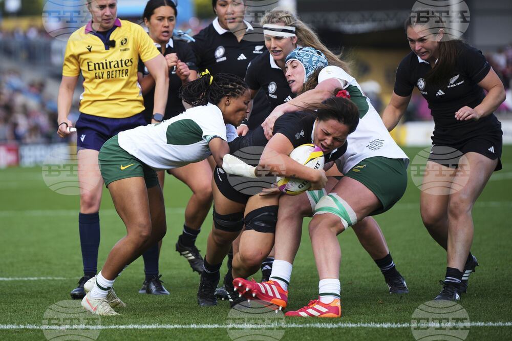 New Zealand's Stacey Waaka, right, battles for the ball with South Africa's Vainah Ubisi, left, during the Women's Rugby World Cup 2025 quarterfinal match between New Zealand and South Africa, in Exeter, England, Saturday, Sept. 13, 2025. (AP Photo/Alastair Grant)
