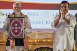 Indian Prime Minister Narendra Modi attends a public rally as Assam chief mister Himanta Biswa Sarma sits at Mangaldoi, north of Guwahati, India, Sunday, Sept. 14, 2025. (AP Photo/Anupam Nath)