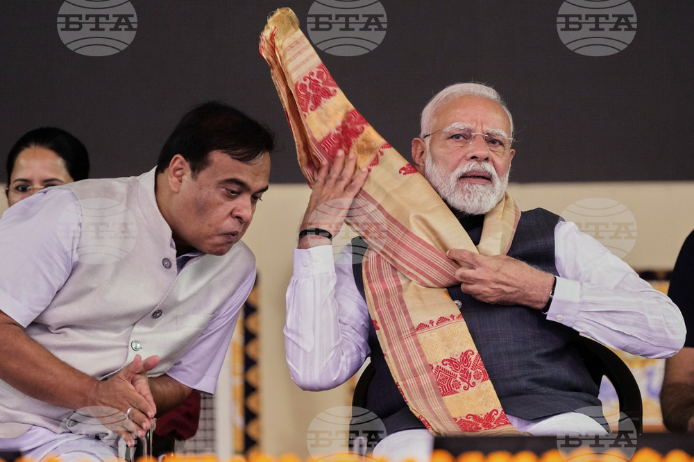 Indian Prime Minister Narendra Modi, left, receives an Assamese traditional Sarai from Assam Chief Minister Himanta Biswa Sarma during the birth centenary celebration of the legendary singer and a biography of the maestro titled Bharat Ratna Bhupen Hazarika in Guwahati, Saturday, Sep. 13, 2025. (AP Photo/Anupam Nath)