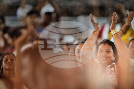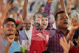Supporters applause as Indian Prime Minister Narendra Modi, unseen, delivers his speech during a public rally at Mangaldoi, north of Guwahati, India, Sunday, Sept. 14, 2025. (AP Photo/Anupam Nath)
