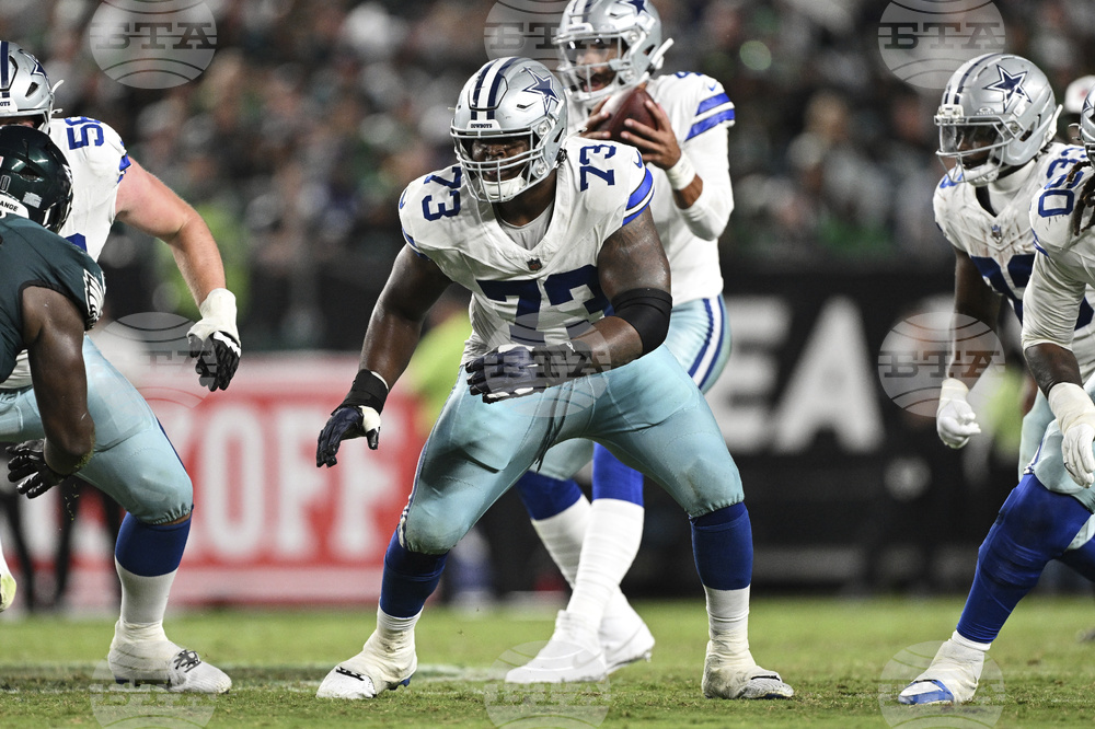 FILE - Dallas Cowboys guard Tyler Smith (73) prepares to block during the second half of an NFL football game against the Philadelphia Eagles, Thursday, Sept. 4, 2025, in Philadelphia. (AP Photo/Terrance Williams, File)