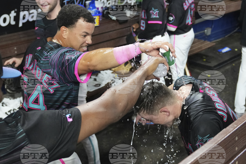 Miami Marlins' Troy Johnston, right, is doused after hitting a walk-off two run homer run during the 11th inning of a baseball game against the Detroit Tigers, Saturday, Sept. 13, 2025, in Miami. (AP Photo/Lynne Sladky)