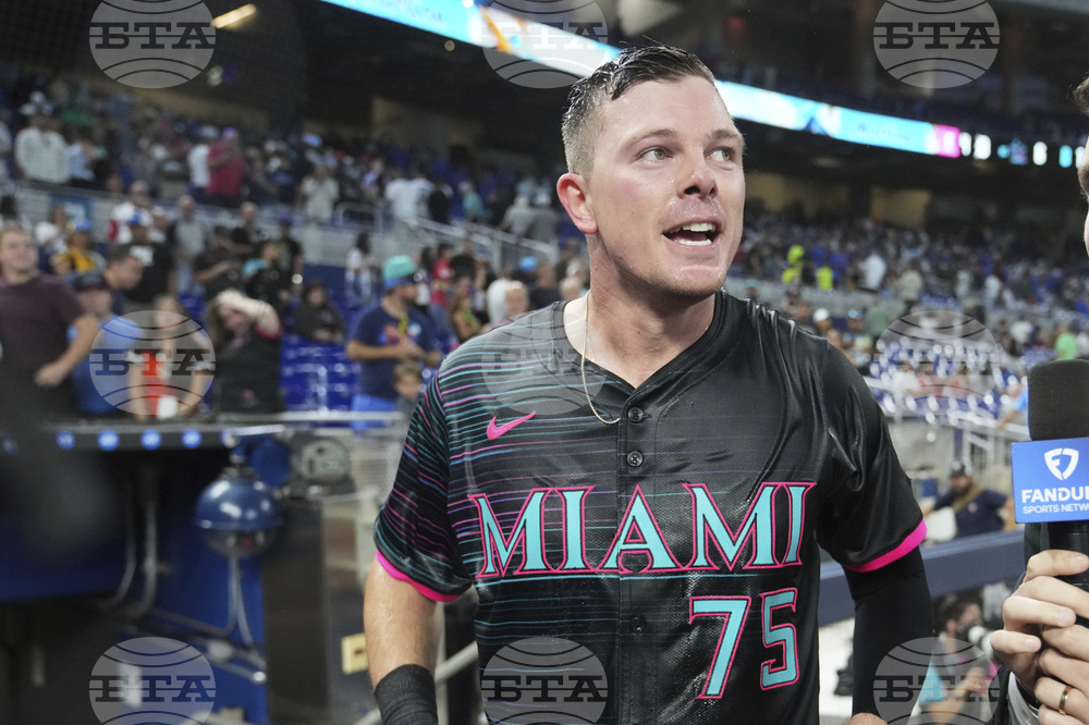 Miami Marlins' Troy Johnston (75) smiles after hitting a walk-off two run home run in the 11th inning of a baseball game against the Detroit Tigers, Saturday, Sept. 13, 2025, in Miami. (AP Photo/Lynne Sladky)