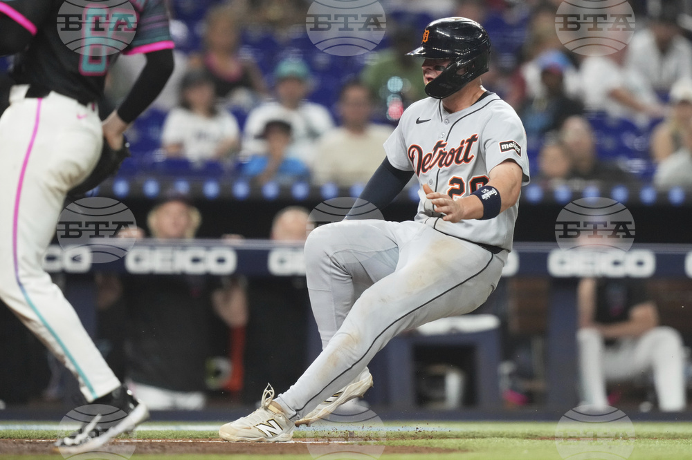Detroit Tigers' Colt Keith (33) scores on a hit by Dillon Dingler during the second inning of a baseball game against the Miami Marlins Sunday, Sept. 14, 2025, in Miami. (AP Photo/Marta Lavandier)