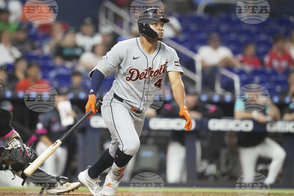 Detroit Tigers' Colt Keith (33) hits a base hit during the second inning of a baseball game against the Miami Marlins Sunday, Sept. 14, 2025, in Miami. (AP Photo/Marta Lavandier)