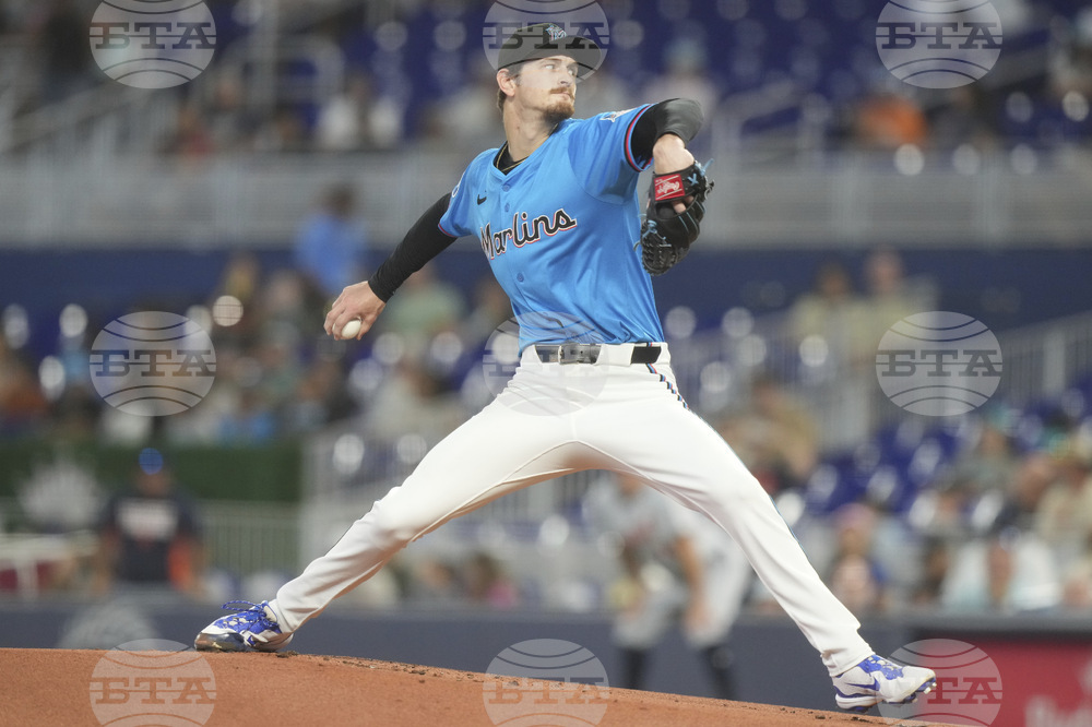Miami Marlins starting pitcher Adam Mazur aims a pitch during the first inning of a baseball game against the Detroit Tigers Sunday, Sept. 14, 2025, in Miami. (AP Photo/Marta Lavandier)
