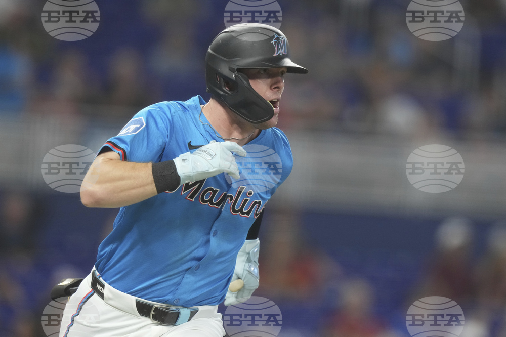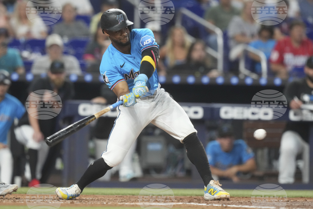 Miami Marlins' Troy Johnston hits a single to center field during the second inning of a baseball game against the Detroit Tigers Sunday, Sept. 14, 2025, in Miami. (AP Photo/Marta Lavandier)