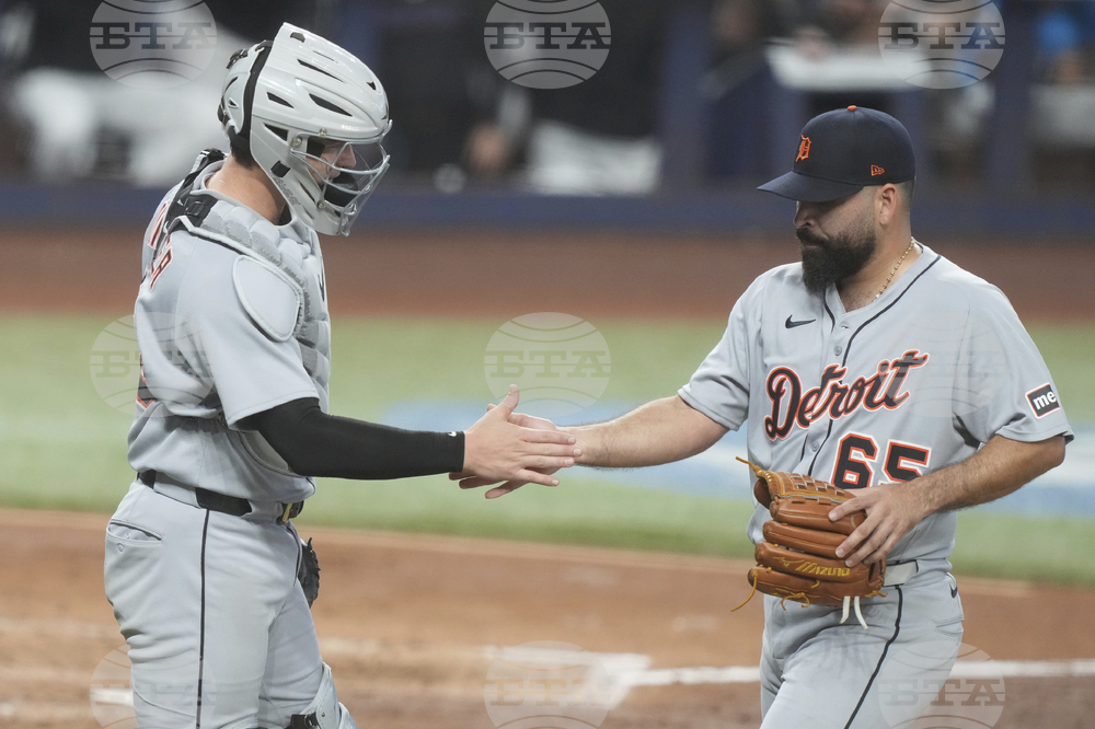 Detroit Tigers pitcher José Urquidy (65) and catcher Dillon Dingler (13) shake hands during the sixth inning of a baseball game against the Miami Marlins Sunday, Sept. 14, 2025, in Miami. (AP Photo/Marta Lavandier)