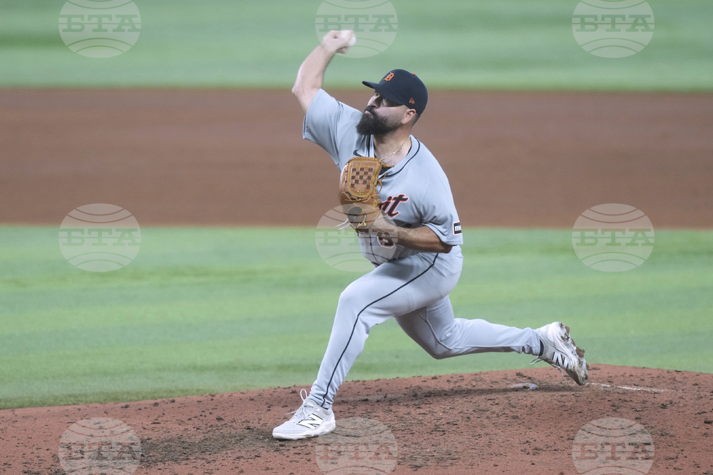 Detroit Tigers relief pitcher Rafael Montero throws during the 11th inning of a baseball game against the Miami Marlins, Saturday, Sept. 13, 2025, in Miami. (AP Photo/Lynne Sladky)