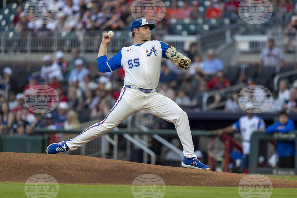 Atlanta Braves pitcher Bryce Elder (55) throws the first pitch during the first inning of a baseball game against the Houston Astros, Saturday, Sept. 13, 2025, in Atlanta. (AP Photo/Erik Rank)