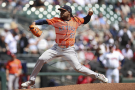 Houston Astros pitcher Framber Valdez (59) delivers in the first inning of a baseball game against the Atlanta Braves, Sunday, Sept. 14, 2025, in Atlanta. (AP Photo/Colin Hubbard)