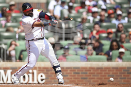 Atlanta Braves' Marcell Ozuna hits a single in the seventh inning of a baseball game against the Houston Astros, Sunday, Sept. 14, 2025, in Atlanta. (AP Photo/Colin Hubbard)