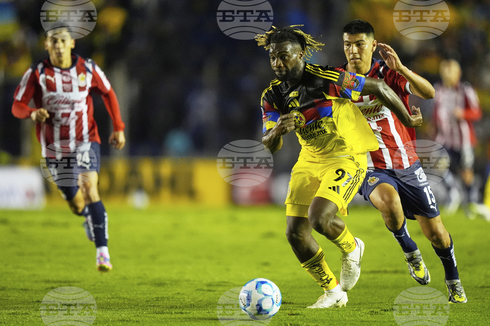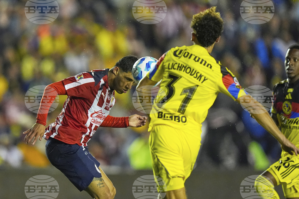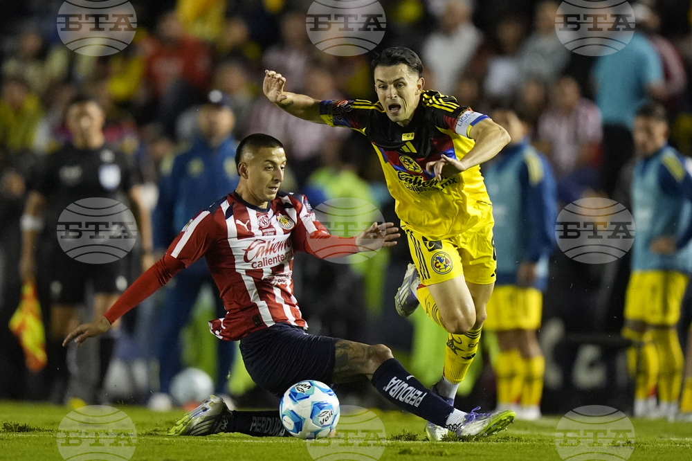 Bryan Gonzalez of Guadalajara, left, heads a ball next to Igor Lichnovsky of America during a Mexican league soccer match in Mexico City, Saturday, Sept. 13, 2025. (AP Photo/Fernando Llano)