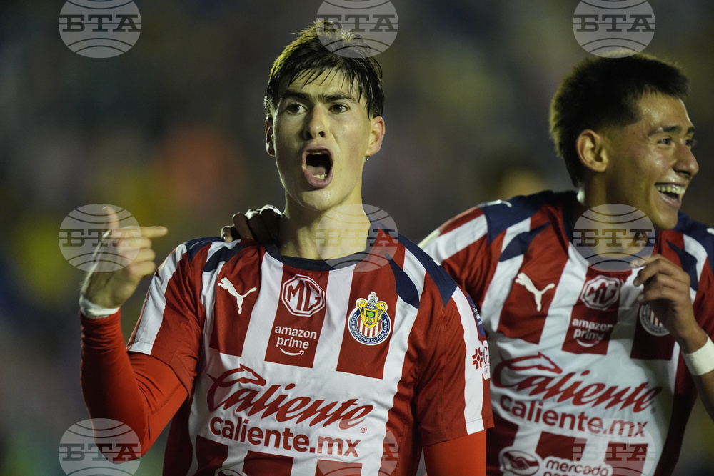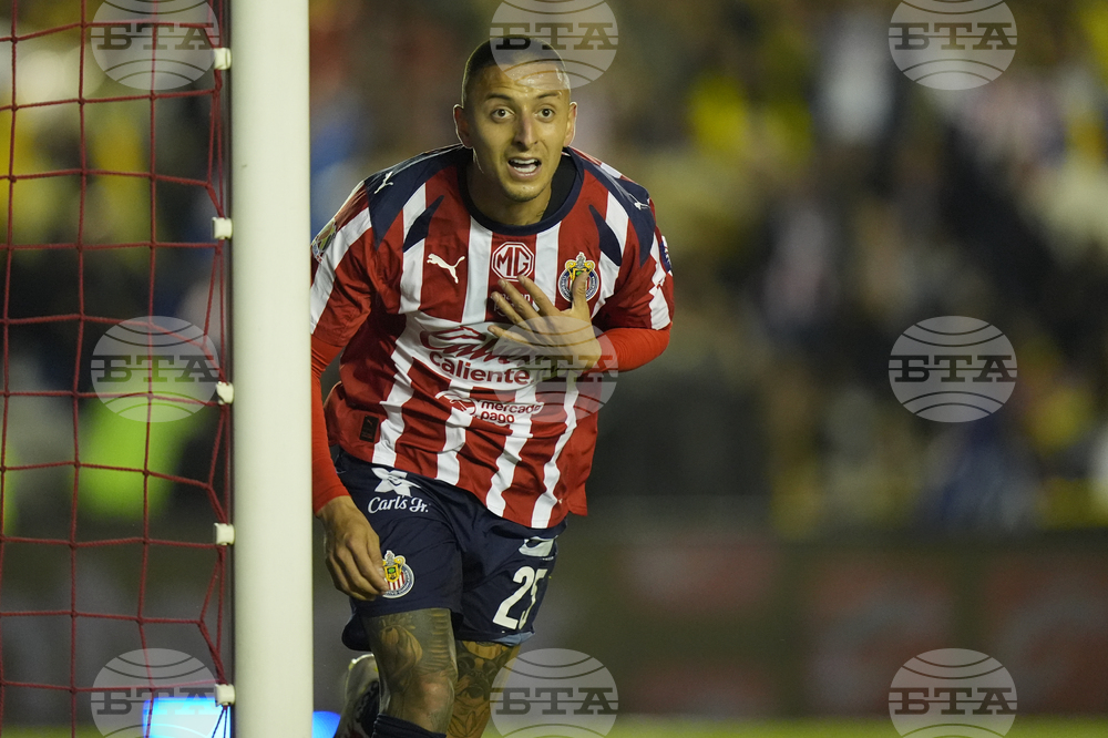 Armando González of Guadalajara, front, celebrates after scoring his side's second goal against America during a Mexican league soccer match in Mexico City, Saturday, Sept. 13, 2025. (AP Photo/Fernando Llano)