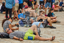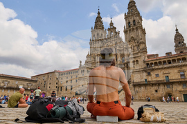 Pilgrims and tourists rest in front of the cathedral in Santiago de Compostela, northwestern Spain, Thursday, Aug. 21, 2025. (AP Photo/Lalo Villar)