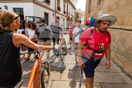 Pilgrims walk in Santiago de Compostela downtown, northwestern Spain, Thursday, Aug. 21, 2025. (AP Photo/Lalo Villar)