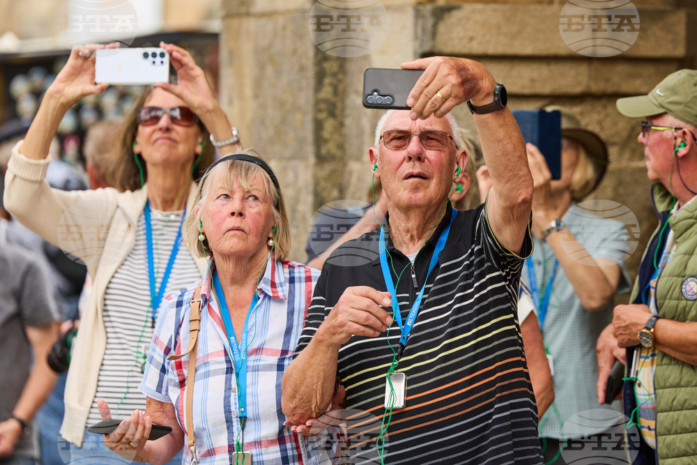 Tourists listen to explanations from a tour guide near the cathedral in Santiago de Compostela, northwestern Spain, Thursday, Aug. 21, 2025. (AP Photo/Lalo Villar)