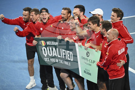 Belgium celebrates after Australia to take the Davis Cup qualifying second round match at Ken Rosewall Arena in Sydney, Sunday, Sept. 14, 2025. (Dean Lewins/AAP Image via AP)