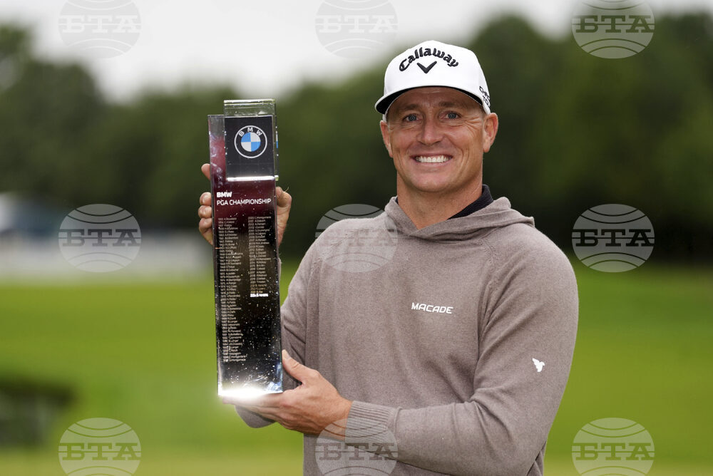 Alex Noren celebrates with the trophy after day four of the 2025 BMW PGA Championship at Wentworth Golf Club in Virginia Water, Surrey, England, Sunday Sept. 14, 2025. (Adam Davy/PA via AP)