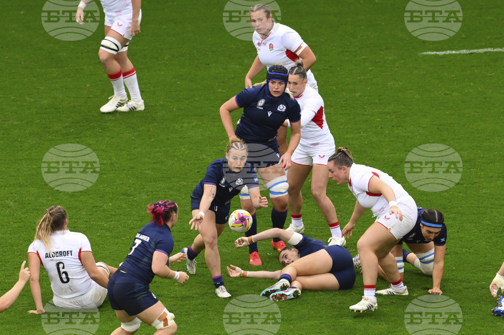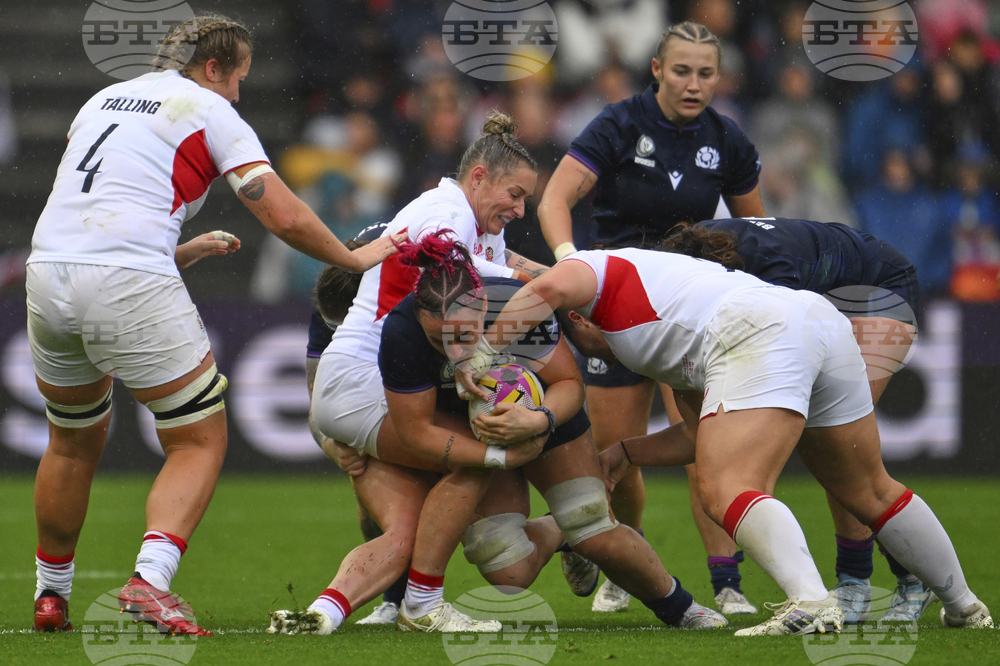 England and Scotland's players contest a line out during the Women's Rugby World Cup 2025 quarter-final match at Ashton Gate, Bristol, England, Sunday Sept. 14, 2025. (Andrew Matthews/PA via AP)