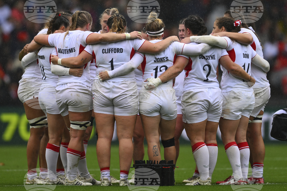 England's teammates in a huddle before the start of the Women's Rugby World Cup 2025 quarterfinal match between England and Scotland in Bristol, England, Sunday, Sept. 14, 2025.(AP Photo/Anthony Upton)