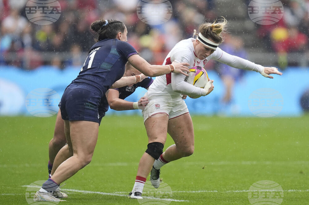 England's Tatyana Heard is tackled during the Women's Rugby World Cup 2025 quarterfinal match between England and Scotland in Bristol, England, Sunday, Sept. 14, 2025.(AP Photo/Anthony Upton)