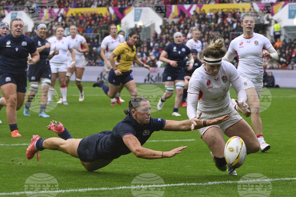 England's Holly Aitchison, left, scores during the Women's Rugby World Cup 2025 quarter-final match between England and Scotland in Bristol, England, Sunday Sept. 14, 2025. (Andrew Matthews/PA via AP)