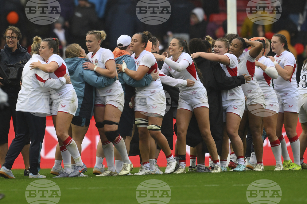 England players react after winning the Women's Rugby World Cup 2025 quarterfinal match between England and Scotland in Bristol, England, Sunday, Sept. 14, 2025.(AP Photo/Anthony Upton)