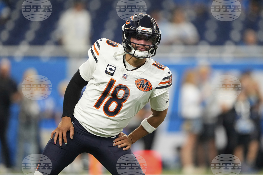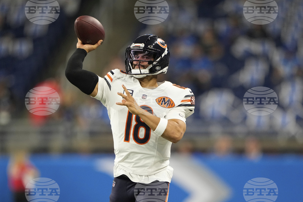 Chicago Bears quarterback Caleb Williams (18) throws before an NFL football game against the Detroit Lions in Detroit, Sunday, Sept. 14, 2025. (AP Photo/Ryan Sun)