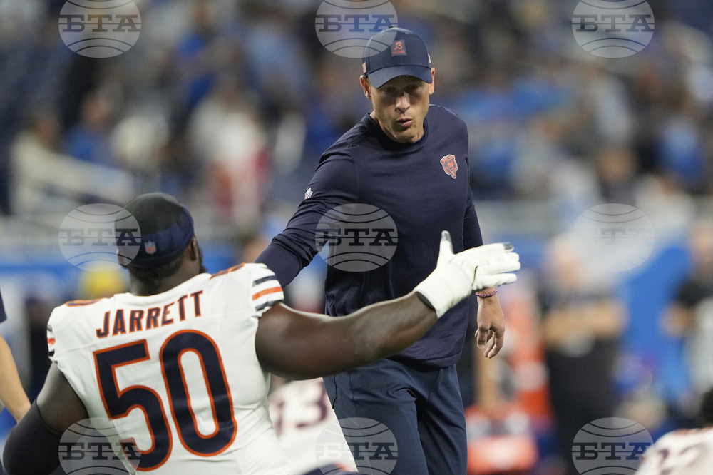 Chicago Bears coach Ben Johnson watches his team warm up before an NFL football game against the Detroit Lions in Detroit, Sunday, Sept. 14, 2025. (AP Photo/Ryan Sun)