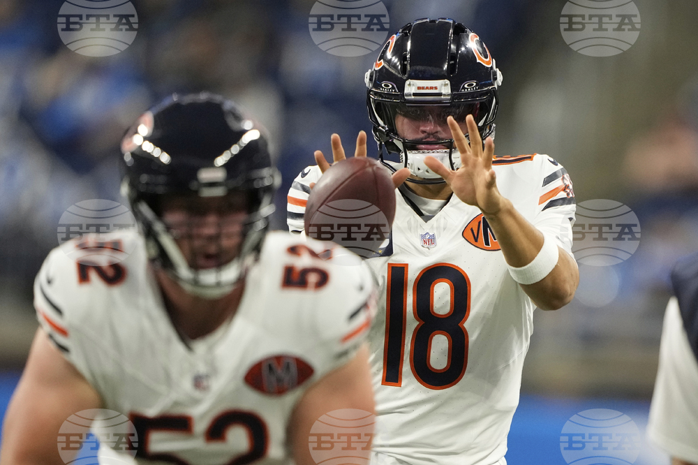 Chicago Bears quarterback Caleb Williams (18) and center Drew Dalman (52) warm up before an NFL football game against the Detroit Lions in Detroit, Sunday, Sept. 14, 2025. (AP Photo/Ryan Sun)