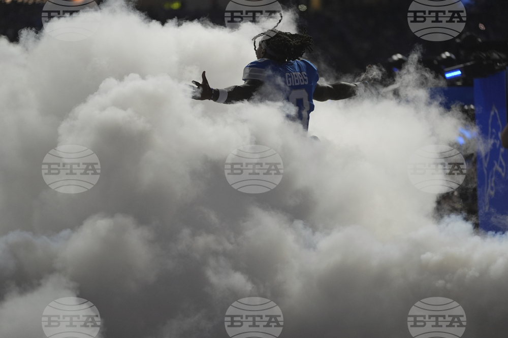 Detroit Lions running back Jahmyr Gibbs (0) runs through a cloud of smoke as he takes the field for an NFL football game against the Chicago Bears in Detroit, Sunday, Sept. 14, 2025. (AP Photo/Ryan Sun)