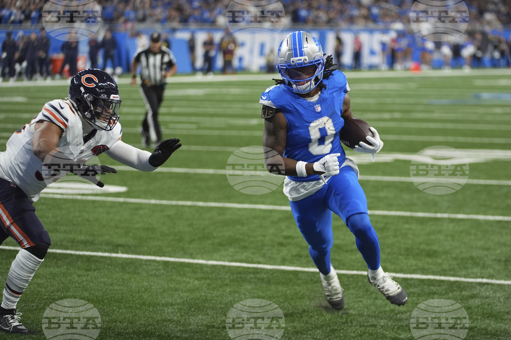 Detroit Lions running back Jahmyr Gibbs (0) scores a touchdown against the Chicago Bears during the first half of an NFL football game in Detroit, Sunday, Sept. 14, 2025. (AP Photo/Paul Sancya)