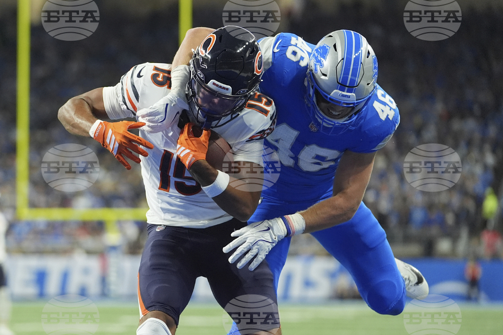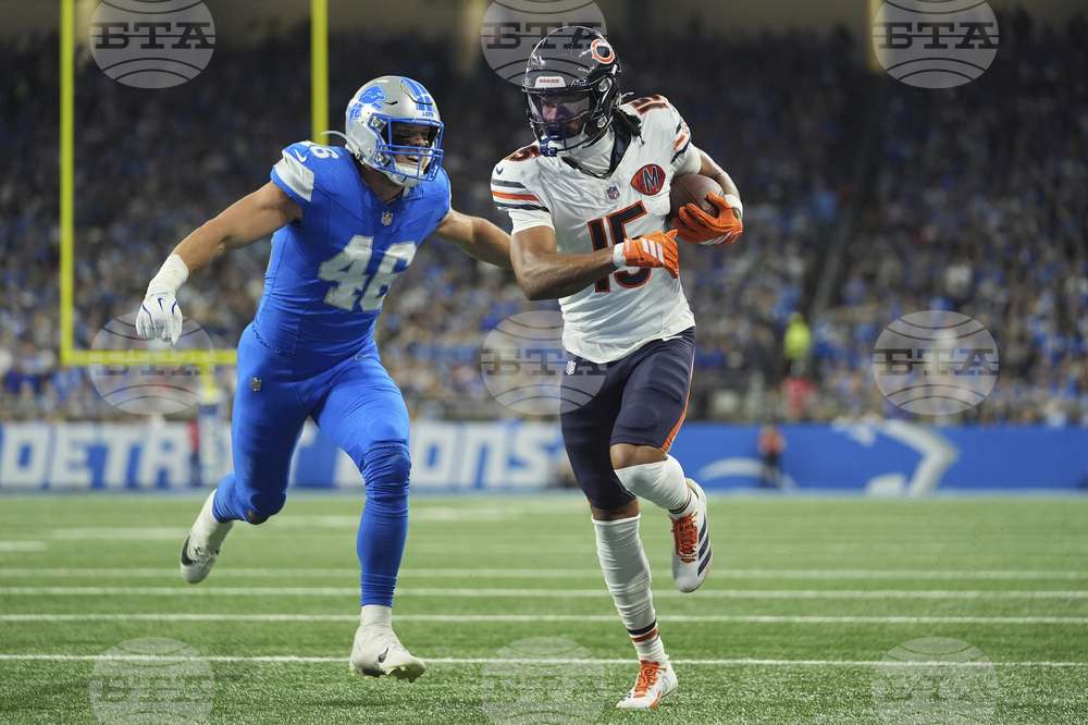 Chicago Bears wide receiver Rome Odunze (15) is hit by Detroit Lions linebacker Jack Campbell (46) as he scores a touchdown during the first half of an NFL football game in Detroit, Sunday, Sept. 14, 2025. (AP Photo/Ryan Sun)