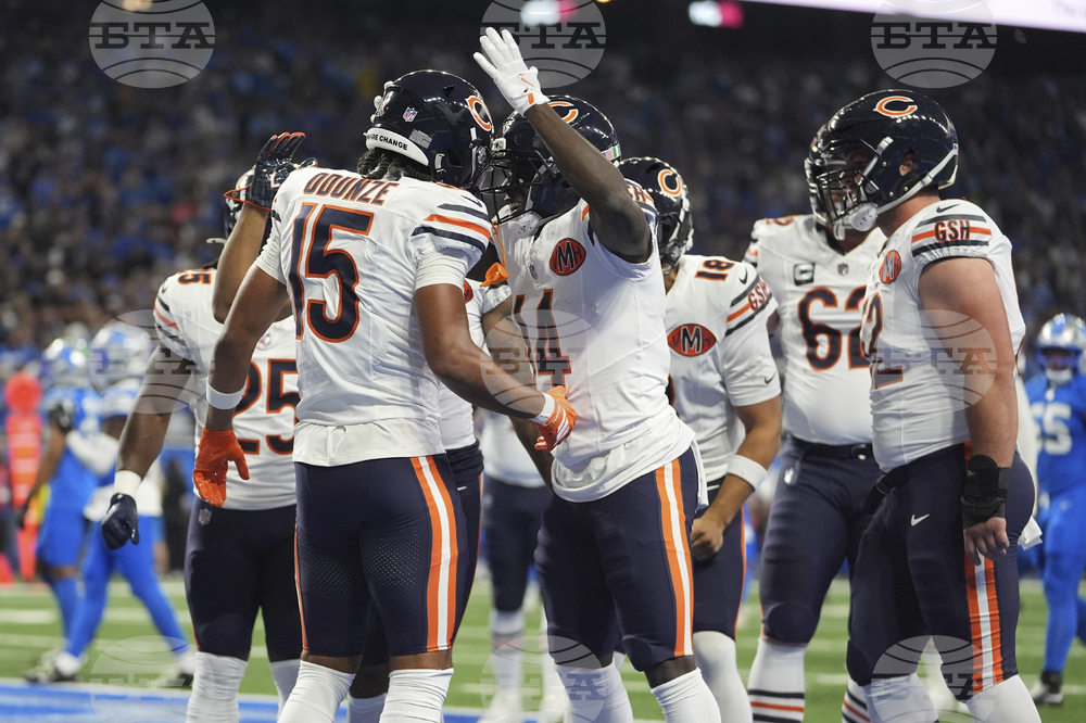 Chicago Bears wide receiver Rome Odunze (15) celebrates with teammates after he scored a touchdown against the Detroit Lions during the first half of an NFL football game in Detroit, Sunday, Sept. 14, 2025. (AP Photo/Ryan Sun)