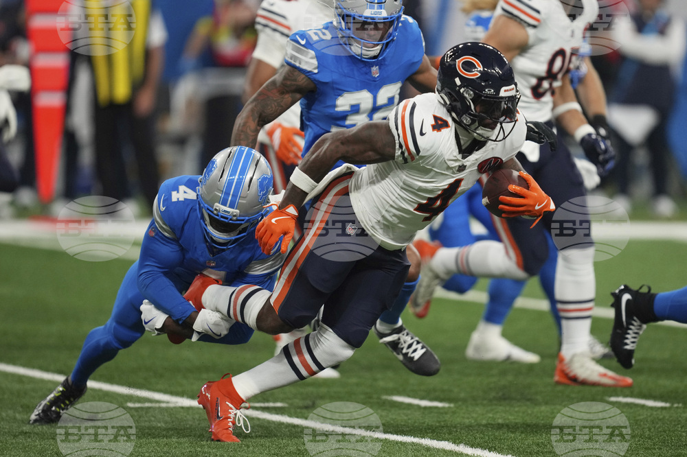 Chicago Bears running back D'Andre Swift (4) runs against the Detroit Lions during the first half of an NFL football game in Detroit, Sunday, Sept. 14, 2025. (AP Photo/Paul Sancya)