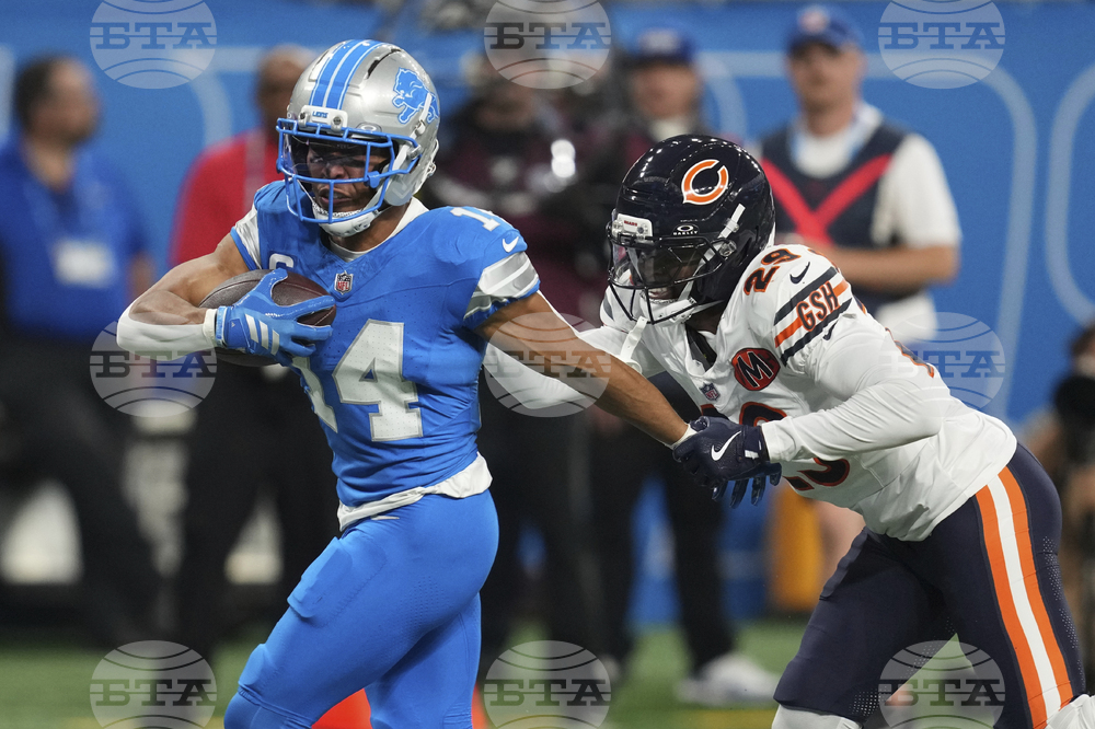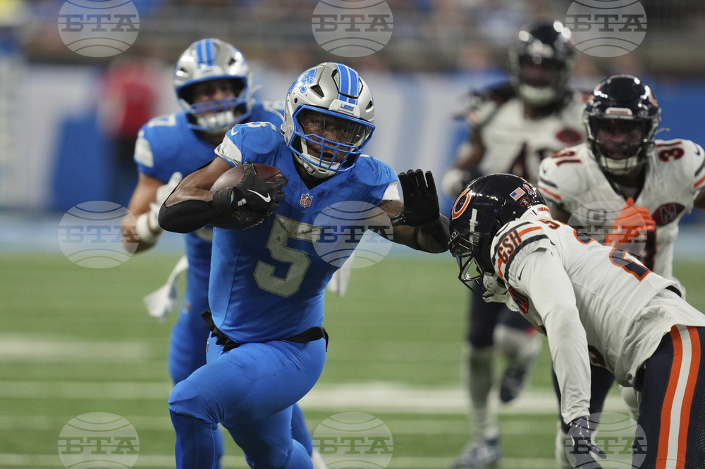 Detroit Lions running back David Montgomery (5) runs against Chicago Bears cornerback Tyrique Stevenson (29) during the first half of an NFL football game in Detroit, Sunday, Sept. 14, 2025. (AP Photo/Paul Sancya)